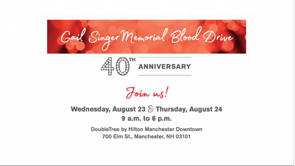 Join us for the 40th Annual Gail Singer Memorial Blood Drive on Wednesday, August 23, and Thursday, August 24, 2023; 9 am-6 pm at the DoubleTree by Hilton Downtown Manchester.